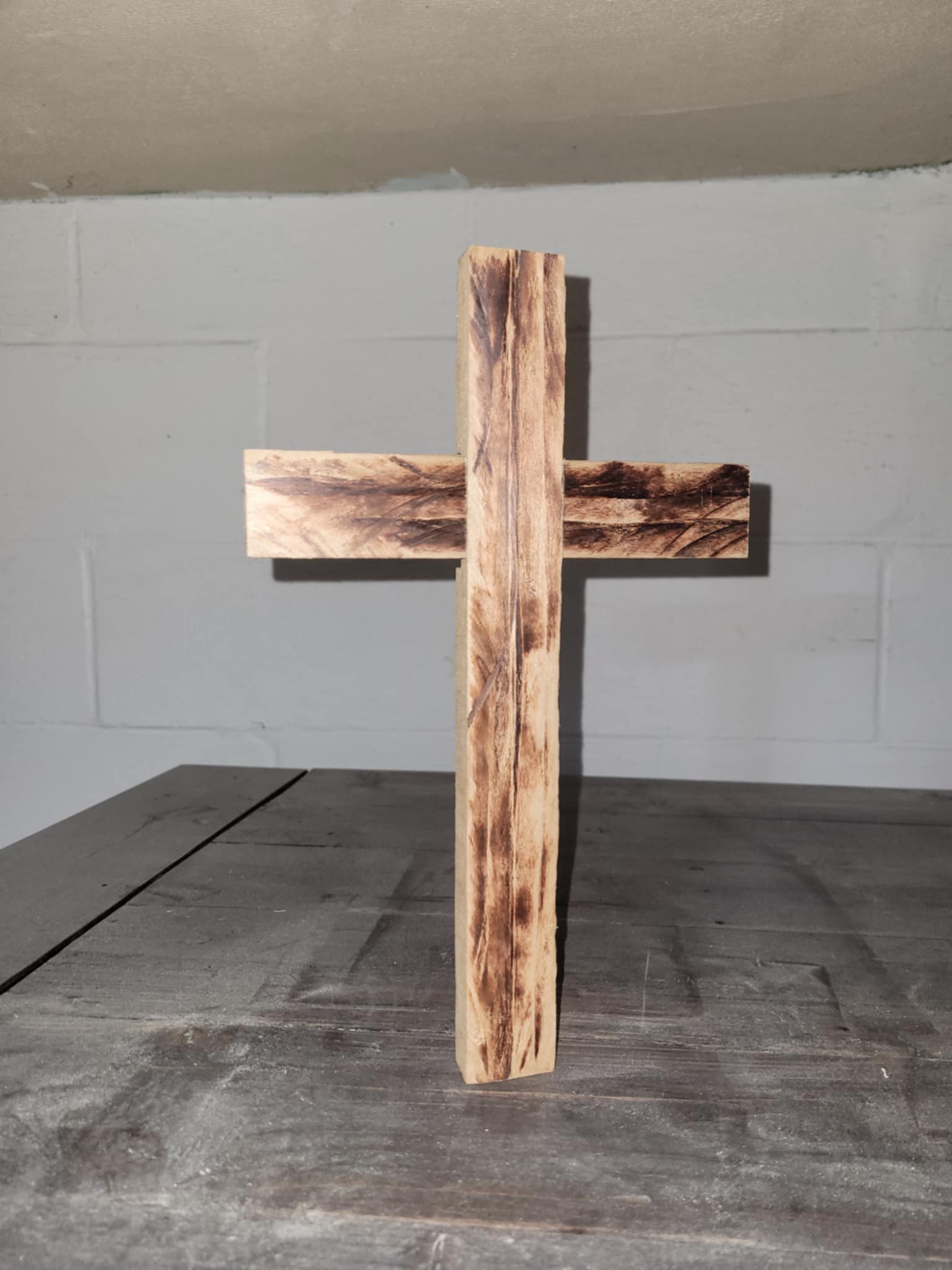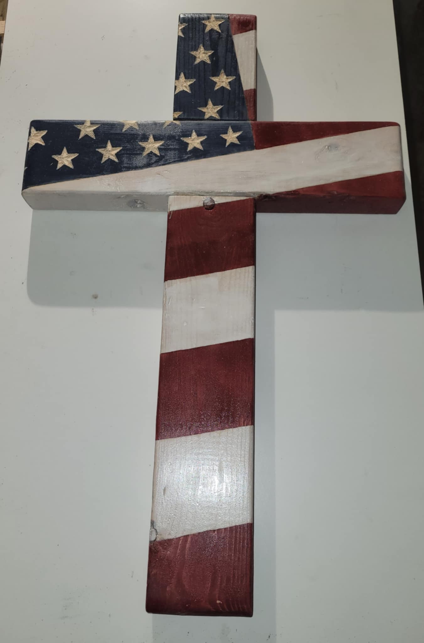 Cross shaped items with distressefd burnt finish and another adorned with the design of an American Flag